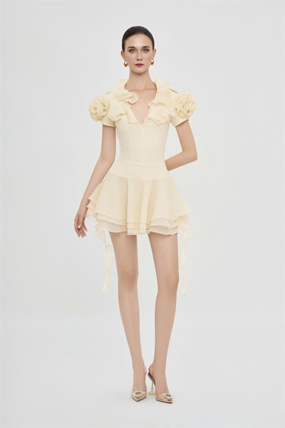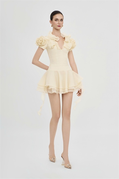Bathed in the soft glow of pastel yellow — one of this year’s most beloved shades — the Fleur de Soleil Dress embodies youthful charm and refined femininity. Inspired by the delicate beauty of the Acapella rose, this mini dress radiates irresistible freshness from the very first glance. Crafted with meticulous care, the design features airy gathered accents at the shoulders, adding a subtle volume that evokes romantic softness. The lightly flared mini skirt enhances graceful movement while offering the perfect length to highlight slender legs without compromising elegance. Effortlessly versatile, the Fleur de Soleil Dress is a celebration of CHYMEOCHY’s signature spirit: youthful, captivating, and timelessly chic. From intimate occasions to sunlit gatherings, it is designed to make every moment unforgettable.| SIZE | BUST | WAIST | HIPS | |||