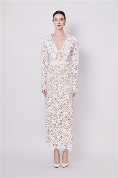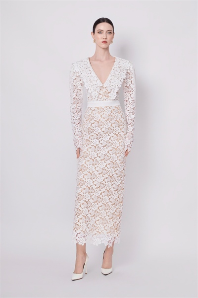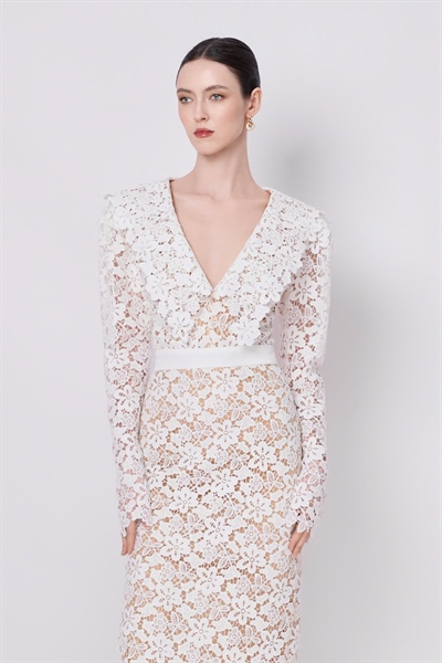 The Ivory Grace Midi Dress embodies effortless sophistication with a touch of vintage charm. Designed with a deep V-neckline elegantly framed by a wide lapel collar, this dress enhances femininity while maintaining an air of refined grace. Its structured yet fluid silhouette strikes the perfect balance between classic and contemporary aesthetics, ensuring a standout presence at any special occasion or formal event.| SIZE | BUST | WAIST | HIPS | |||