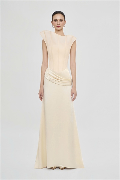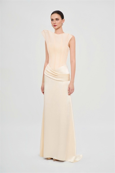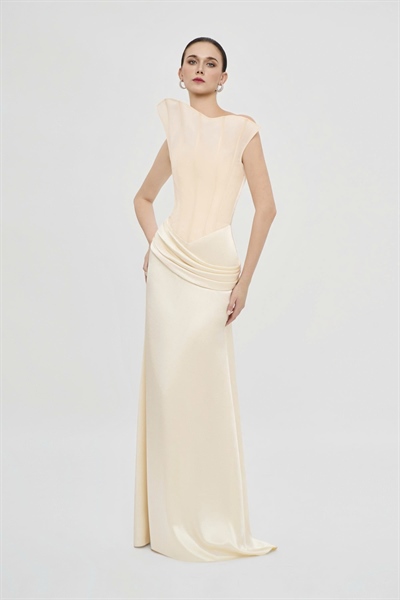 Awakened by the first light of morning, the Lily Dawn Gown embodies quiet sophistication with a timeless beige palette. The ethereal organza detail blooms like lily petals at dawn, a sculptural accent that radiates softness and grace. Its skirt, delicately pleated like branches gently unfolding in the early sun, creates a sense of fluid elegance with every step. Crafted from lustrous satin, the gown balances refined femininity with a whisper of allure, making it a captivating choice for elegant occasions. This design is not only a garment but a poetic moment—where light, fabric, and movement converge to celebrate the CHYMEOCHY woman’s elegance. Step into radiant poise with the Lily Dawn Gown, and let your presence blossom like morning light.| SIZE | BUST | WAIST | HIPS | |||