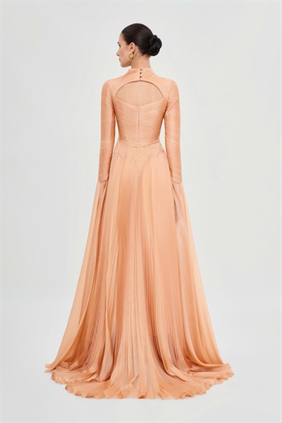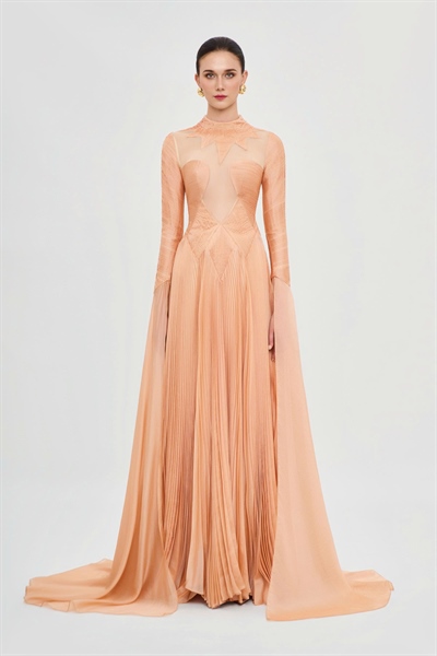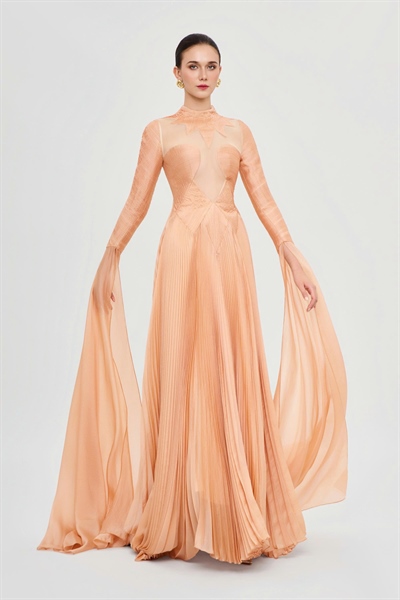 This gown carries the breath of the Middle East, envisioned as a symphony of autumn leaves. Warm hues of gold, crimson, and amber intertwine, reminiscent of the fleeting yet radiant beauty of maple leaves in a breezy fall afternoon. Crafted from airy, flowing chiffon, the design evokes lightness and grace in every step. The pleated full-length skirt cascades elegantly, while the elongated overlay adds a refined and distinctive touch, creating the impression of nature’s dance upon the feminine silhouette. The sharp, precise cut-out detail becomes the striking focal point—an ode to allure, sophistication, and timeless charm. More than an evening gown, it is a masterpiece celebrating the harmony of culture and haute couture artistry, where beauty transcends time through every ethereal fold of chiffon.| SIZE | BUST | WAIST | HIPS | |||