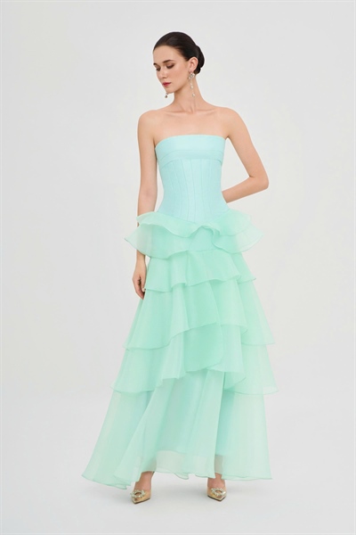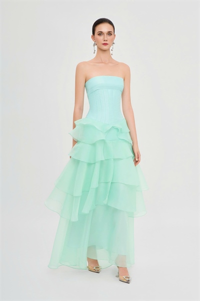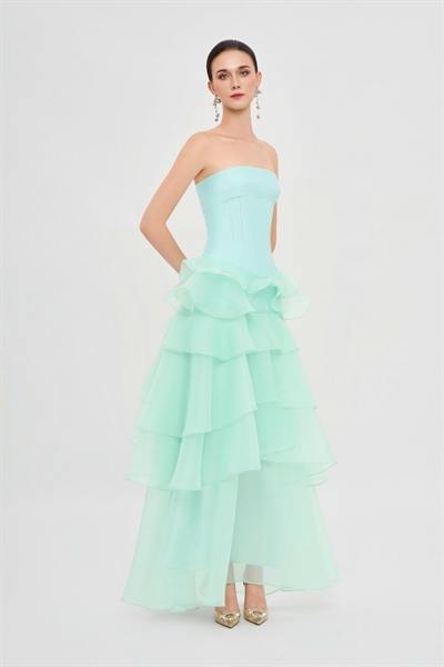 The Mint Cascade Gown is a poetic vision of modern romance, painted in a delicate mint hue that evokes freshness and serenity. Meticulously tailored from layers of airy chiffon, the gown creates a cascading waterfall effect — fluid, weightless, and dreamlike with every movement. Its silhouette balances modern sophistication with a touch of timeless allure. The sculpted sweetheart neckline enhances the décolleté, while precise panel cuts accentuate a slender waistline. Designed for grand soirées and elegant gatherings, this gown ensures the CHYMEOCHY woman becomes the luminous centerpiece of every celebration. An ode to grace and refinement, the Mint Cascade Gown captures the harmony of artistry, craftsmanship, and effortless femininity.| SIZE | BUST | WAIST | HIPS | |||