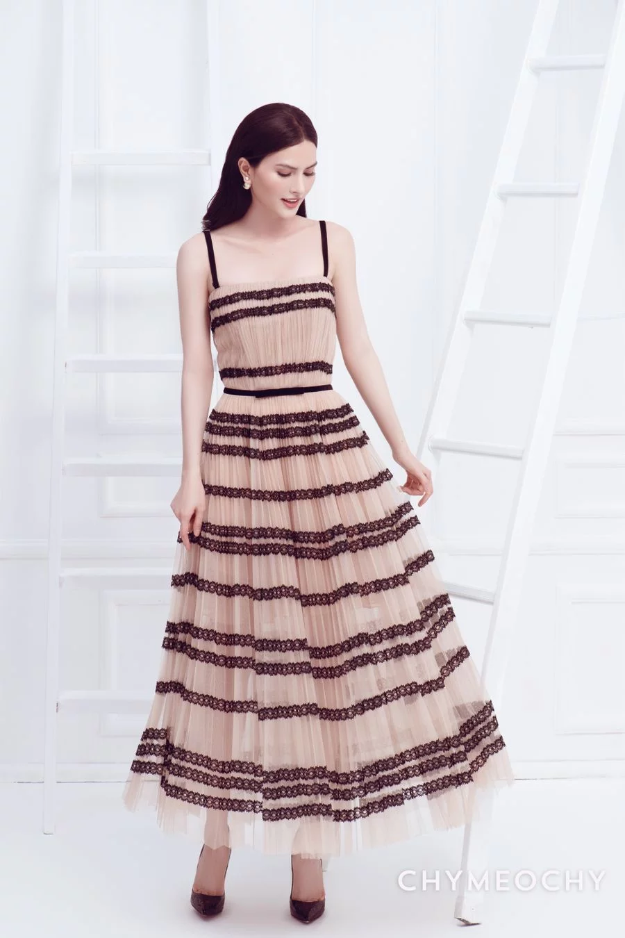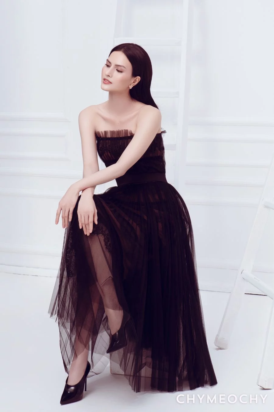 Mỗi thiết kế mùa này của CHYMEOCHY đều nhấn mạnh vào màu đen, trắng và be, tập trung vào phom dáng mềm mại, rất nữ tính nhờ kỹ thuật xếp ly áp dụng cho lưới, ren và những đường cắt tinh tế.