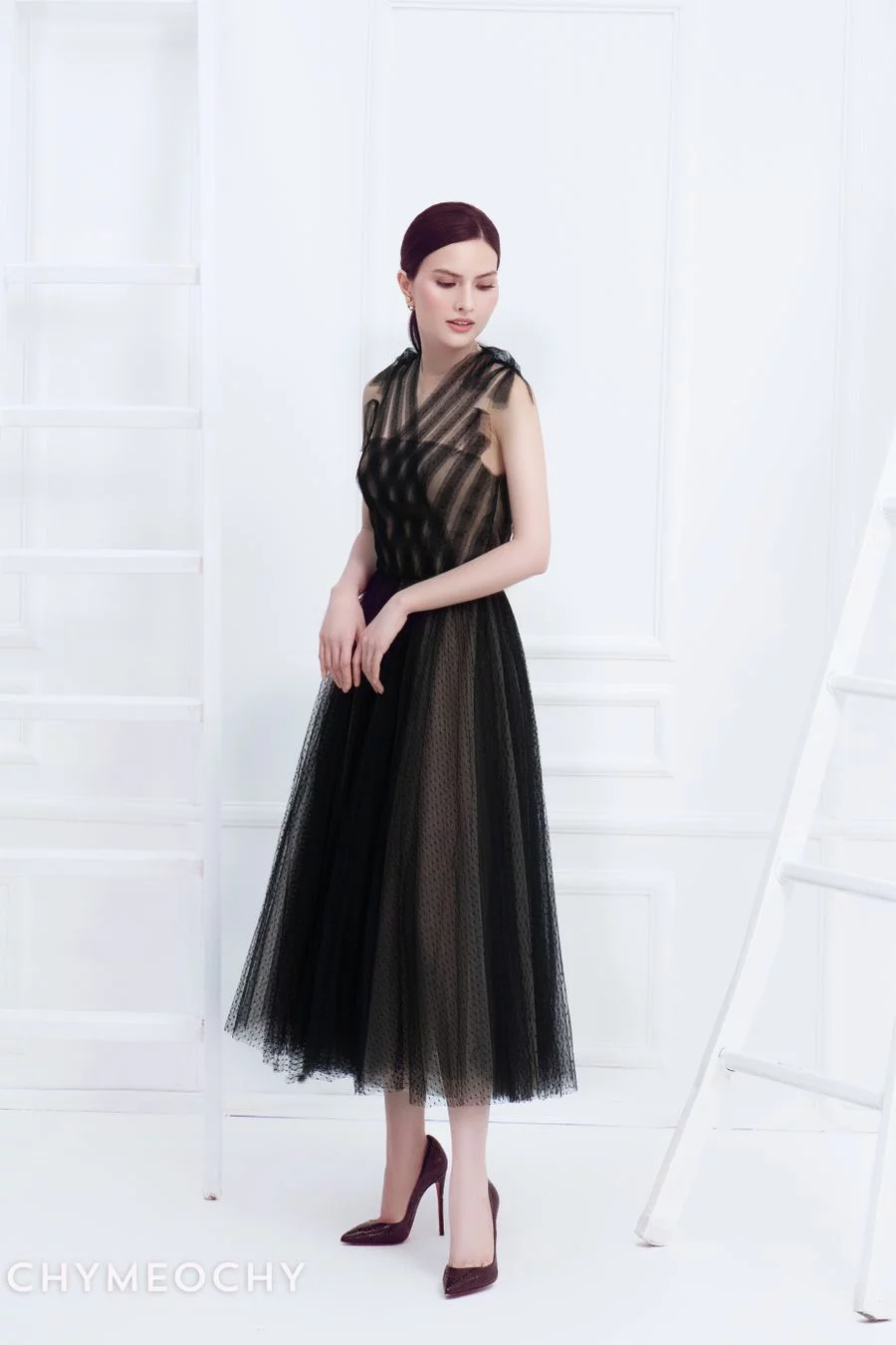 Chân váy voan trong mờ dệt họa tiết chấm bi trên nền lưới xuyên thấu và cúp ngực cúp ngực quyến rũ nhưng tinh xảo mang đến cho các quý cô của CHYMEOCHY vẻ ngoài tươi tắn, quyến rũ, lôi cuốn và tự tin.